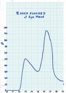 finally pushed the river level over 350 cms into flooding. In between, low rainfall allowed the river to drop at the rate of 100 cms/day, very quickly for a large river. The difference in rate of fall was caused by flooded fields in the flood plain releasing water to the river slowly. The existance of the flood plain also limited the rise of the river to 20 cms above 350. Without the flood plain, the rise would have been around 200 cms above 350. The graph shows the effectiveness of the flood plain in limiting flooding downstream. An analysis of the higher flood (385) of 3 Dec 2005 gives similar results. |