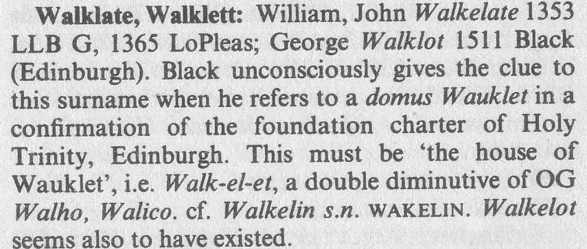 The origin of the surname WALKLATE, scan taken from "A Dictionary of English Surnames" by Oxford University Press,