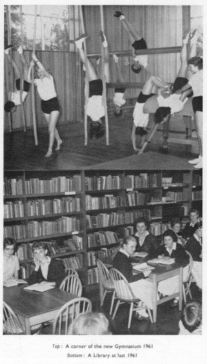 In 1953 for the first time choirs from schools throughout the county rehearsed a common programme of songs, and in May met together for a morning of rehearsal under the guidance of Dr. Armstrong of Christ Church, Oxford, before the first Southwell Music Festival, held in the cathedral. Later in the year the first joint concert with the grammar school was held: a project which proved highly successful. The school also joined in the ambitious Festival of the Queen's Music organised by the County Education Committee in honour of the Queen's Coronation, and the fourth form choir spent days and nights touring the county. The Hockey 1st XI, backed by the energy and enthusiasm of Miss Boyd, was unbeaten by any school and fell victim only to more experienced teams from Eaton Hall and the Retford Ladies' Club. The first tennis VI, too, beat all comers at its own age. Following fast on Miss Southam's departure came the appointment of Miss Leonard as Headmistress of Wisbech High School. Mr. Tomlinson, who for seventeen years was groundsman at the school playing field, retired at the end of the summer term. At the Christmas carol service a group of violinists accompanied some of the carols. Girls from the school joined in for the first time in a musical venture with the boys of the grammar school, and presented a joint production of "The Mikado". This was a welcome addition to the activities shared by the two schools. One of the most exciting events at Sports Day that year was the senior high jump competition won by Judith Clay whose winning leap of five feet nine inches broke the existing school record. The most consistently interesting section of the magazines is that which relates to the activities of Old Girls. The year 1954 is no exception. Old Girls of the school were to be found in the four corners of the world. Jane Walker was in Kenya, where the Mau-Mau terrorists were in full-cry, doing research into the behaviour of sheep ticks. Patience Lang had been appointed assistant lecturer in rural science at Lincoln College, Christchurch, New Zealand. Mary Hale was teaching history and Latin in Toronto, Canada, and Joan Bing was a missionary in India. Nearer home, Sybil Peatfield, a pupil of Miss Arblaster's, had been appointed Headmistress of Stoke Damerel High School, Devenport, while Barbara Keal, another Old Girl, had become an Independent member of the Retford Borough Council, in the recent local government elections. In may 1955 the school was the host of Her Majesty's Inspectors, who "not only invaded the classrooms but, as unseen presence from the vantage point of the library, watched with eagle eye the comings and goings across the courtyard". In their report on the work of the school they emphasised the crying need for an adequate library. In spite of a very wet season the hockey first eleven played thirteen matches, losing only to Newark High School and the school's own Old Girls, while the second eleven ended the season with a succession of wins. In the inter-school swimming competition held at Lincoln the school was proud that their team competing against five others was placed first. As a result of her previous year's achievements, Cherry Suttle had in October, 1954, represented the Midlands in the National Swimming Trials. For the first time for some years girls had entered for the Royal Life Saving Society Association's Bronze Medal and the eight who entered were all successful. In 1955 the senior girls decided that they would prefer the Sports run entirely as a House activity. This meant the disappearance of the senior and junior Victrix Ludorum awards. On Sports Day, in spite of the unaccustomed heat, or perhaps because of it, three of the school's athletic records were broken. Jean Thompson set up a new record for the intermediate high jump with a height of 4ft. 5 in. and also broke the long jump record with a jump of 15 ft. 4~ in. Sarah Page broke the junior broad jump record with a jump of 7ft. 3~ in. Margaret Sheppard, as in 1954, was again chosen to ran for the county in the National Championships. In 1955 Mr. Underwood who had been a member of the governing body for eighteen years retired at the age of ninety. Three new governors Mr. W.A. Robinson, Mrs. V.J.S. Vickers and Mrs. E. Wilson were appointed during the year. Thanks to a generous bequest by the late Alderman Clay, who was for many years a member of the governing body, the school in 1956 had in addition to the Yarmouth Commemoration Prize a second scholarship which would be awarded annually to a girl going on to further training. A reading competition, the prizes for which were kindly presented by Mrs. Williamson, was introduced as a part of the school life at this point, to emphasise the value of clarity of expression. Another innovation in 1956 was the Parents' Association, which provided, and continues to provide, a close tie between home and school. The Association has grown over the years and gives an opportunity for parents and staff to discuss the merits or demerits, the strength or weakness, of the girls. The size of the membership and of the meetings shows the eagerness of parents to help their daughters in every possible way. Closely allied with the foundation of the Parents' Association was the Leavers' Fund, and the school benefited by a cheque for library books from the Parents' Association. The school held an Open Day in 1956 when, in addition to seeing some of the work of the children, watching a puppet play, a mannequin parade and a gymnastic display, parents were entertained to a concert in which the school orchestra made its first public appearance. Among the general activities of the year, pride of place must certainly be given to the production of "Lady Precious Stream", the school's first production for five years. The autumn term of 1955 witnessed the birth of a new society, the Inter-Sixth Form Society, consisting of members of both the High School and Grammar School. Its purpose was to provid