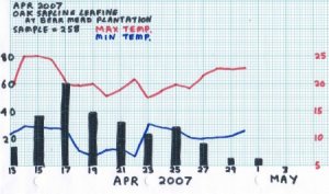 What does the coming summer hold? Many people are predicting hot and dry. The oak is out well before the ash. The plantation has grass and rich soil on clay, which dries out and cracks. Last year there were 5 months of hot drought. The water table dropped by 160 cms (over 5 feet) between