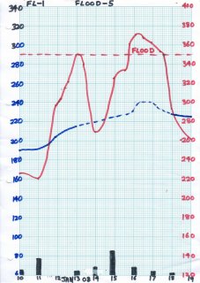 finally pushed the river level over 350 cms into flooding. In between, low rainfall allowed the river to drop at the rate of 100 cms/day, very quickly for a large river. The difference in rate of fall was caused by flooded fields in the flood plain releasing water to the river slowly. The existance of the flood plain also limited the rise of the river to 20 cms above 350. Without the flood plain, the rise would have been around 200 cms above 350. The graph shows the effectiveness of the flood plain in limiting flooding downstream. An analysis of the higher flood (385) of 3 Dec 2005 gives similar results. |