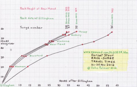 Rain-Surge Travel Times from Gillingham to Throop 21-27 Nov 2012.
