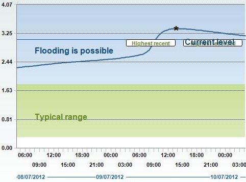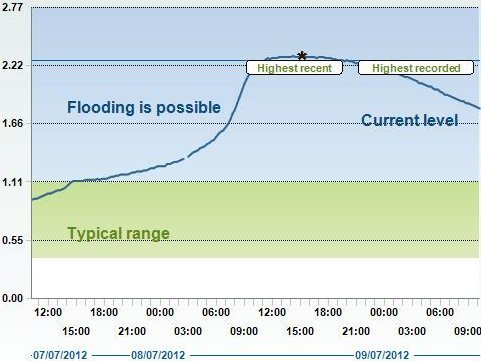 Blandford peak of 2.30 metres at 1500 hrs on 08jul2012