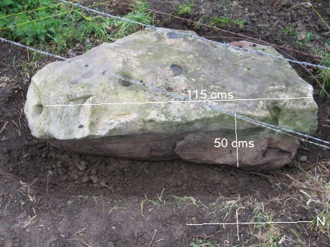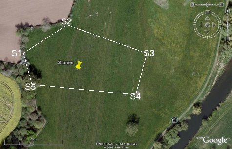 A similar toppled monolith is known at SY 988-998, about 600 metres to the NNE, on the other side of the Stour in the Cowgrove area. Called the "Moonstone", it appears to consist of similar fine limestone to the "Bearstone". Approximate dimensions are 1.2 m high x .75 m wide (base) and 0.2 m wide (apex) x 0.4 m depth, volume about 0.18 cubic metres, suggesting a weight for the Moonstone of 477 kg (44% of the Bearstone). If the source of the stone is indeed Purbeck, both monoliths could have been transported by water, by sea from Purbeck to Christchurch harbour, then up the Stour to less than 200 metres from their present locations. The shapes of the Bearstone and the Moonstone are very similar. An OS map, (2nd edition, dated 1902, surveyed 1885, 6" maps XXXIV NE and XXXIV SE) shows 5 "stones" in a rough circle, centred on SY-992-996. The Bearstone lies 570 metres to the South West of this circle, and just possibly may have acted as the "hele" stone. The Moonstone may also have been associated with this circle. None of the 5 encircled stones were visible above the surface in 2008. It is likely that many of these stones are boundary stones used before the Inclosure Act in 1805 to mark the meeting points of unfenced fields. The Bearstone was finally raised on 7 Aug 2008, with the help of Gerry Watkins (digger) and Farmer Martin. It slipped into its socket pit without a problem, and was quickly packed round with earth and flints. Nothing was found underneath except clay. A time capsule has been left in a natural hollow in its base. It needs a bit of cleaning.