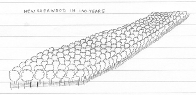 300 Quercus robur saplings in 10 litre pots in the Nursery are ready to plant in the field. All were collected as acorns from the Major Oak in Sherwood Forest, 225 in the year 2000, 75 in 2002. Size varies from 0.3 m to 1.1 m tall. A spacing of 10 metres is suggested, planting rank-and-file requires 184. It is proposed to plant out the largest 100 within the deer-fence in February 2004, the next 100 in 2005, leaving the final 100 as spares. The perimeter deer-fence is necessary because of roe-deer found all year in moderate numbers.