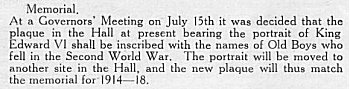 plaque, mounted in the Assembly Hall 1938-2003. In 1948 it was decided